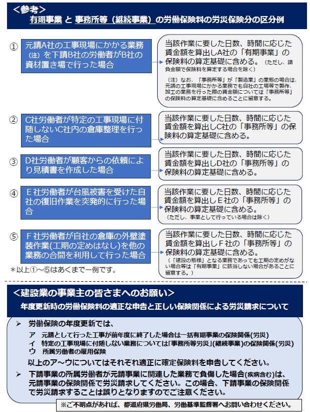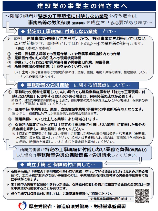 建設業において「特定の工事現場に付随しない業務」がある場合は、「事務所等の労災保険(末尾6)」の保険関係の成立手続きをお願いします。また、労災保険の申告において、建設作業員が「特定の工事現場に付随しない業務」に従事した際の賃金について申告漏れにならないようご注意ください。