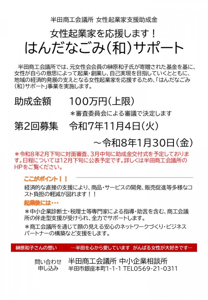半田商工会議所では、元女性会会員の榊原和子氏が寄贈された基金を基に、女性が自らの意思によって起業・創業し、自己実現を目指していくとともに、地域の経済的発展の支えとなる女性起業家を応援するため、「はんだなごみ(和)サポート」事業を実施します。