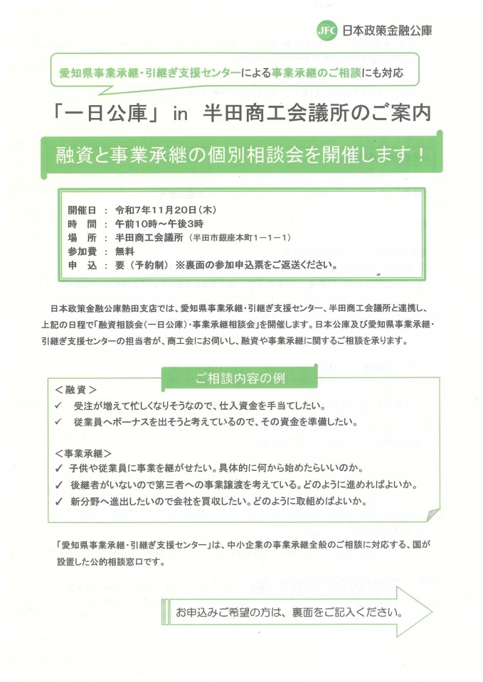 日本政策金融公庫熱田支店では、愛知県事業承継・引継ぎ支援センター、半田商工会議所と連携し、「融資相談会(一日公庫)・事業承継相談会」を開催します。